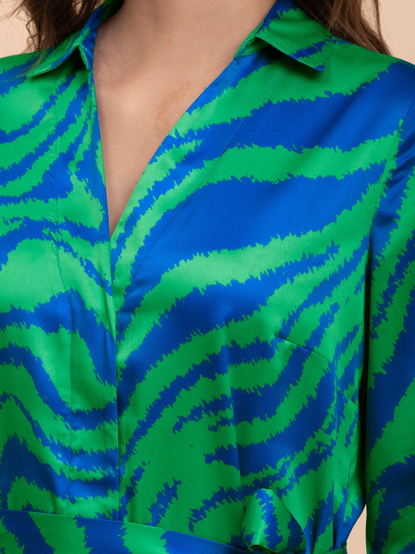 This royal blue and green A-Line dress has animal print. It has a V-neck and three-quarter sleeves. Made from Satin, it is soft and comfortable to wear.