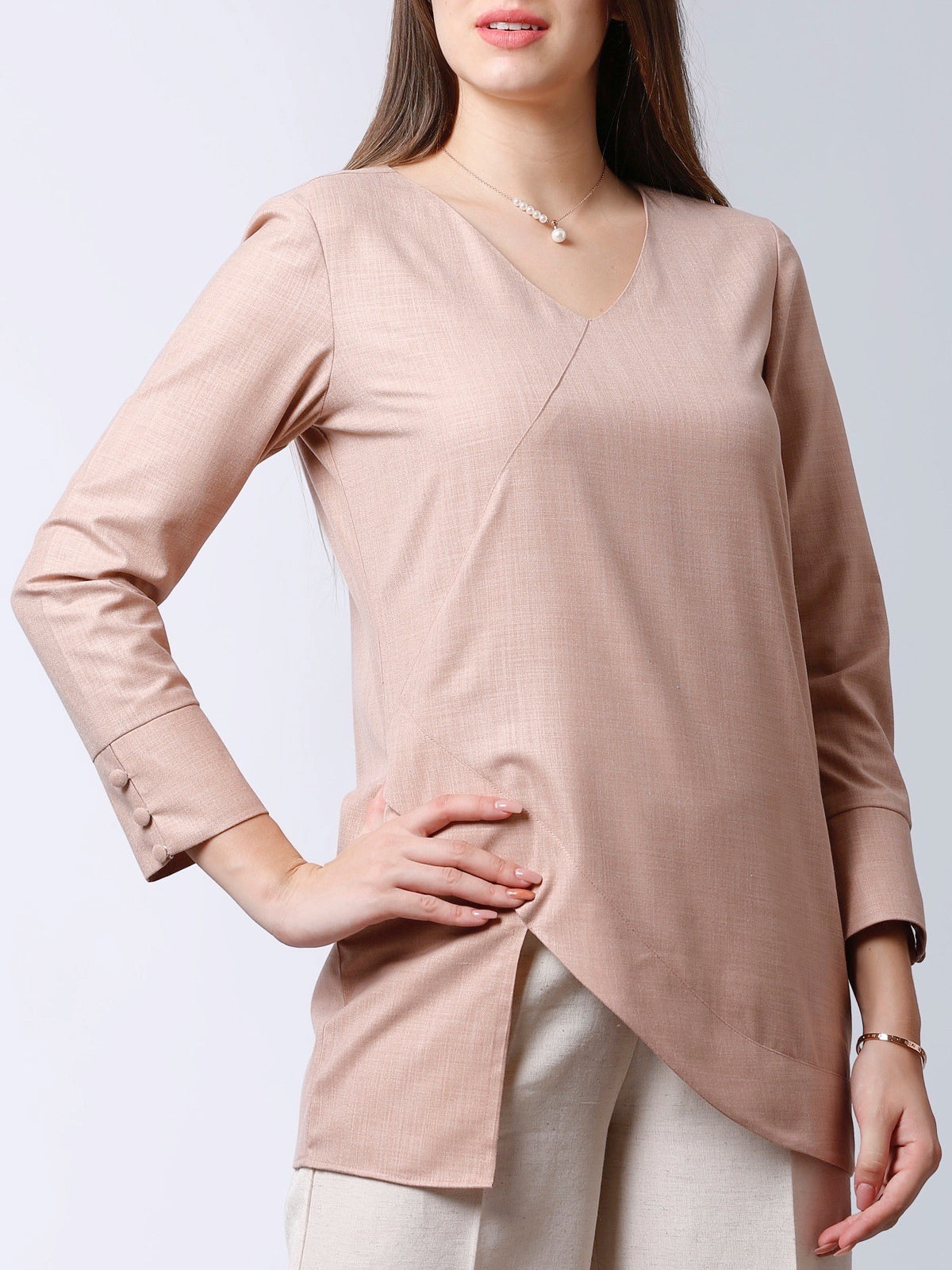 There is nothing like a minimal top to keep you at ease all day. Meet our pretty pink top with a V neck, asymmetric hem and ¾ sleeves with buttons. A blend of Polyester and Viscose, it is lightweight, self-textured, immensely soft, anti-pill and wrinkles lightly. The hem of the top is intended to fall according to the image on a height of 5'3" to 5'5". The model is wearing a tailored fit with measurements of chest being 36 inches and hips as 40 inches. Colour may vary slightly according to screen settings and resolution.